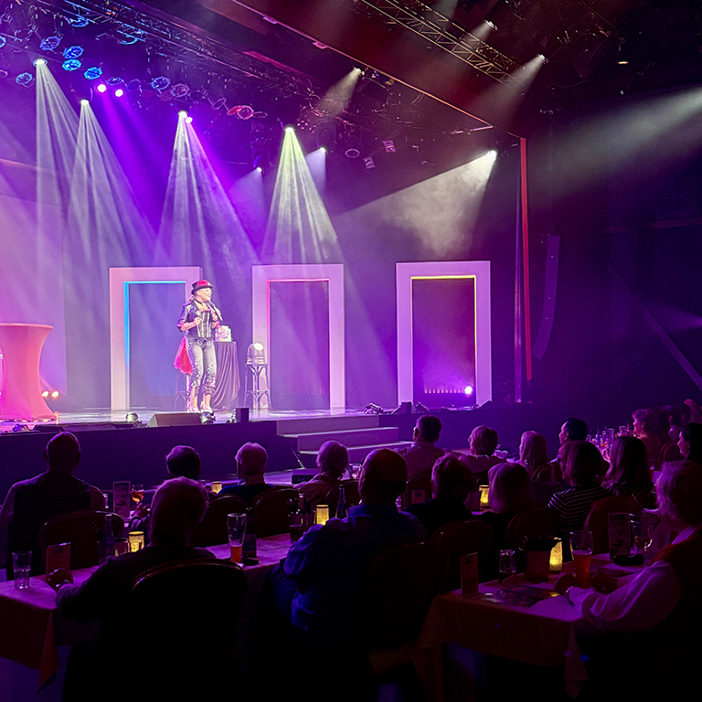 Ob Weihnachtsfeier, Firmenjubiläum oder Vereinsabend: Sabine sorgt mit mehreren Showblöcken dafür, dass zwischen den Gängen nicht nur gegessen, sondern auch Tränen gelacht wird.